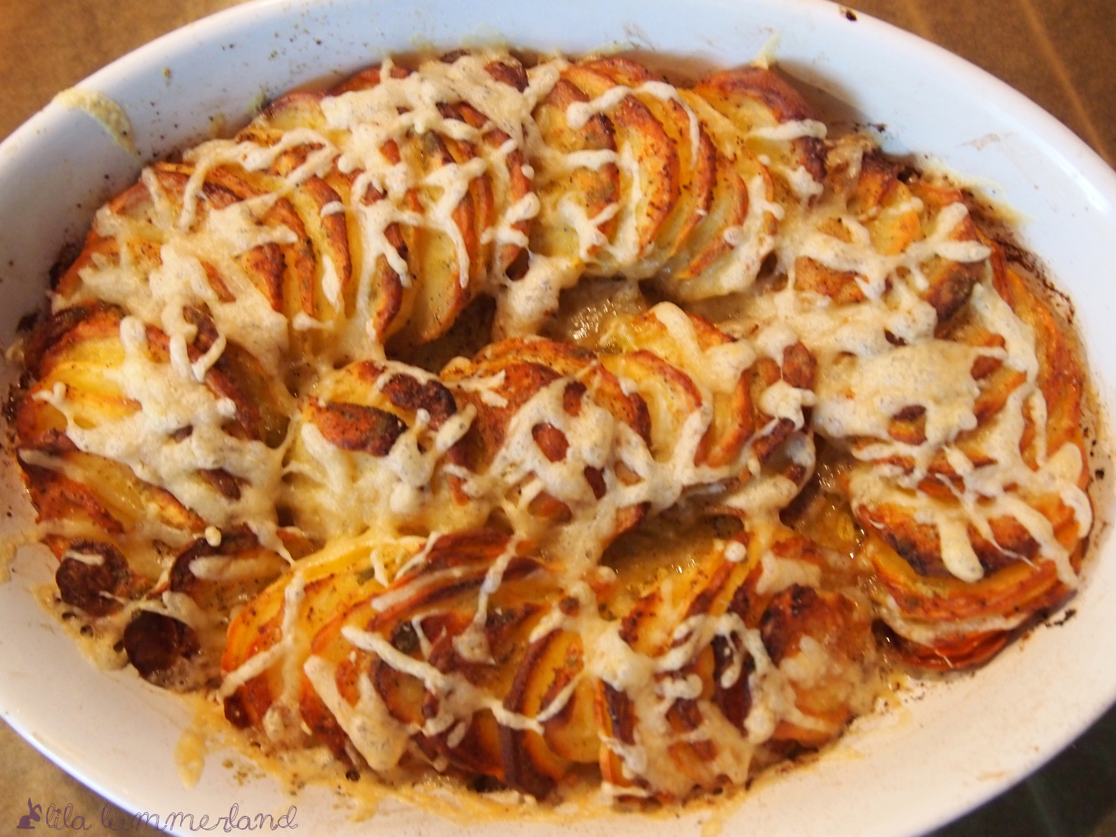 Öl-Mischung über den Kartoffelscheiben verteilen, Kartoffeln bei 200°C 40-45 min backen. Dann vorsichtig mit ein wenig Käse bestreuen und weiterbacken, bis der Käse geschmolzen ist.