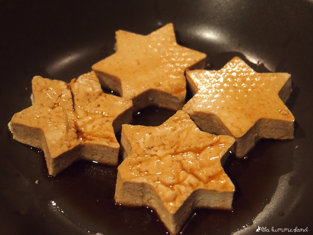 Tofu würfeln (oder mit einem Keksausstecher in eine hübsche Form bringen) und eine Stunde in Sojasauce marinieren, zwischendurch wenden.