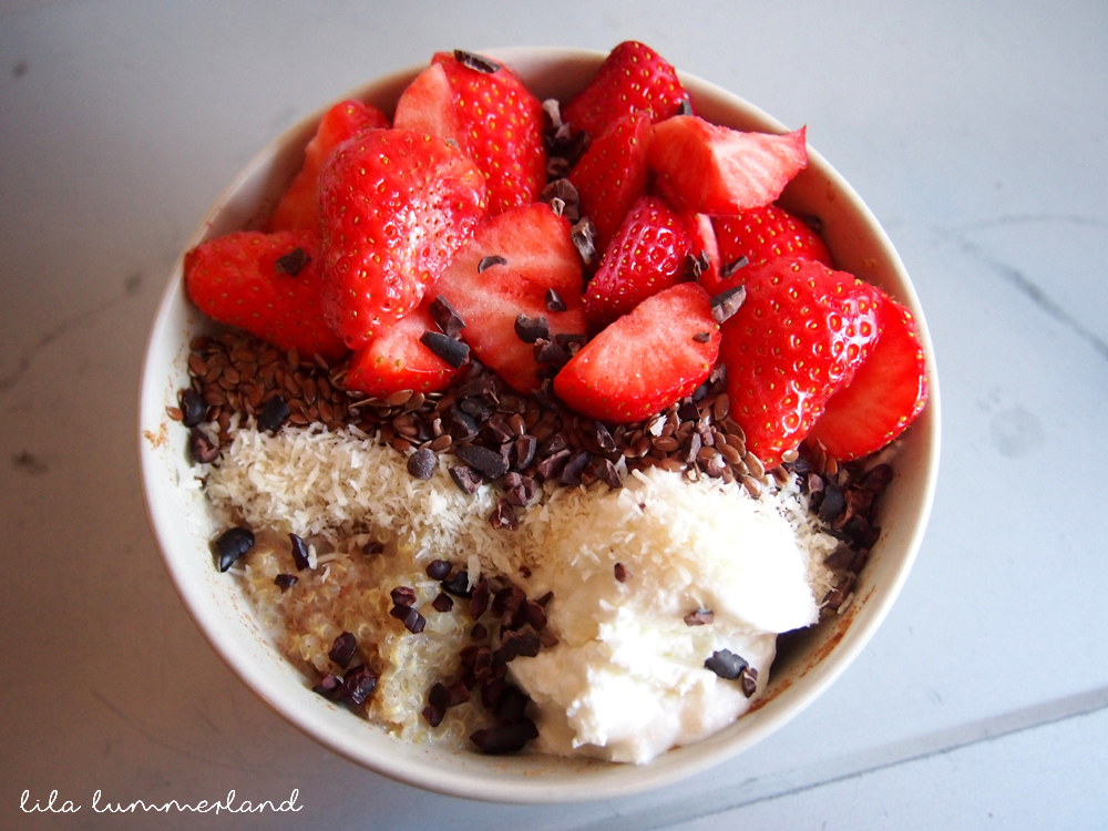 Toppen könnt ihr euren Porridge mit frischen oder tiefgefrorenen Früchten (die würde ich aber über Nacht im Kühlschrank auftauen lassen) oder auch mit ein bisschen Joghurt. Das schmeckt lecker und  so ein warmes Frühstück tut einfach gut – sogar im Sommer.