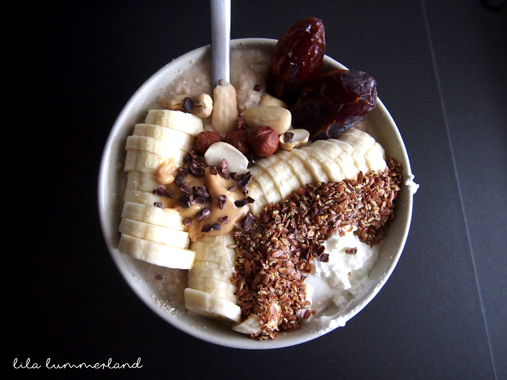So, jetzt habt ihr eine Grundlage. Aber die lässt sich beliebig aufmotzen. Ganz oben auf der Pimp-your-breakfast-Liste: frisches, saisonales Obst – und Zimt! Außerdem Nüsse aller Art oder Trockenfrüchte, wenn ihr die mögt. Außerdem gehören für den Frischekick (und für den Proteingehalt) auch immer Joghurt oder Magerquark für mich zum Topping dazu.