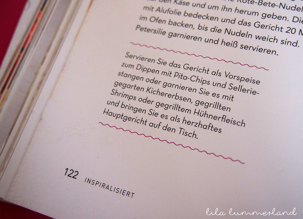 Schade finde ich, dass nicht alle Rezepte bildlich abgebildet sind. Dafür gibt es zu den Rezepten immer noch einen – oft überflüssigen – Einleitungstext, den man beim Kochen ohnehin nicht liest und der daher irgendwie fehl am Platz ist. Die kleinen Zubereitungstipps oder Alternativ-Vorschläge hingegen finde ich sehr gut und alltagstauglich!