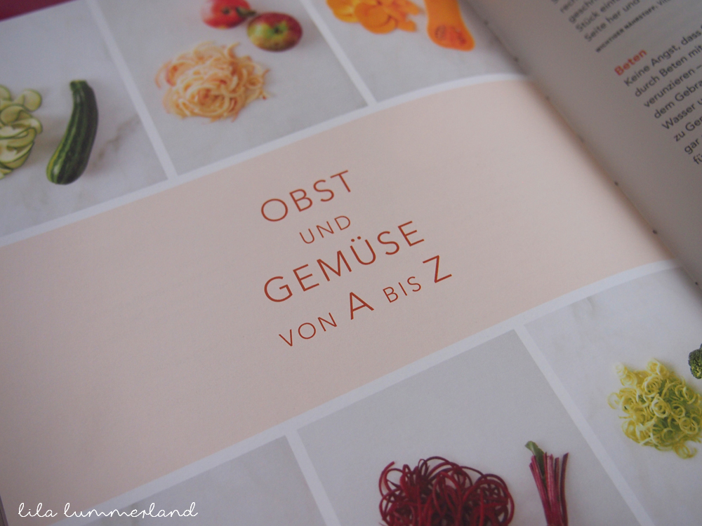 Außerdem gibt es eine Reihe von Tipps zu Einkauf, Lagerung und Zubereitung der verwendeten Gemüse und den daraus hergestellten Spiralen. Aus Erfahrung stimme ich nicht allen Tipps zu: Zucchinispiralen halten z.B. keine fünf Tage im Kühlschrank – sie werden nach zwei bis drei Tagen bitter. Aber prinzipiell sind ihre Hinweise wirklich gut und sehr hilfreich – v.a. wenn man sich gerade erst mit Gemüsespiralen zu beschäftigen beginnt.