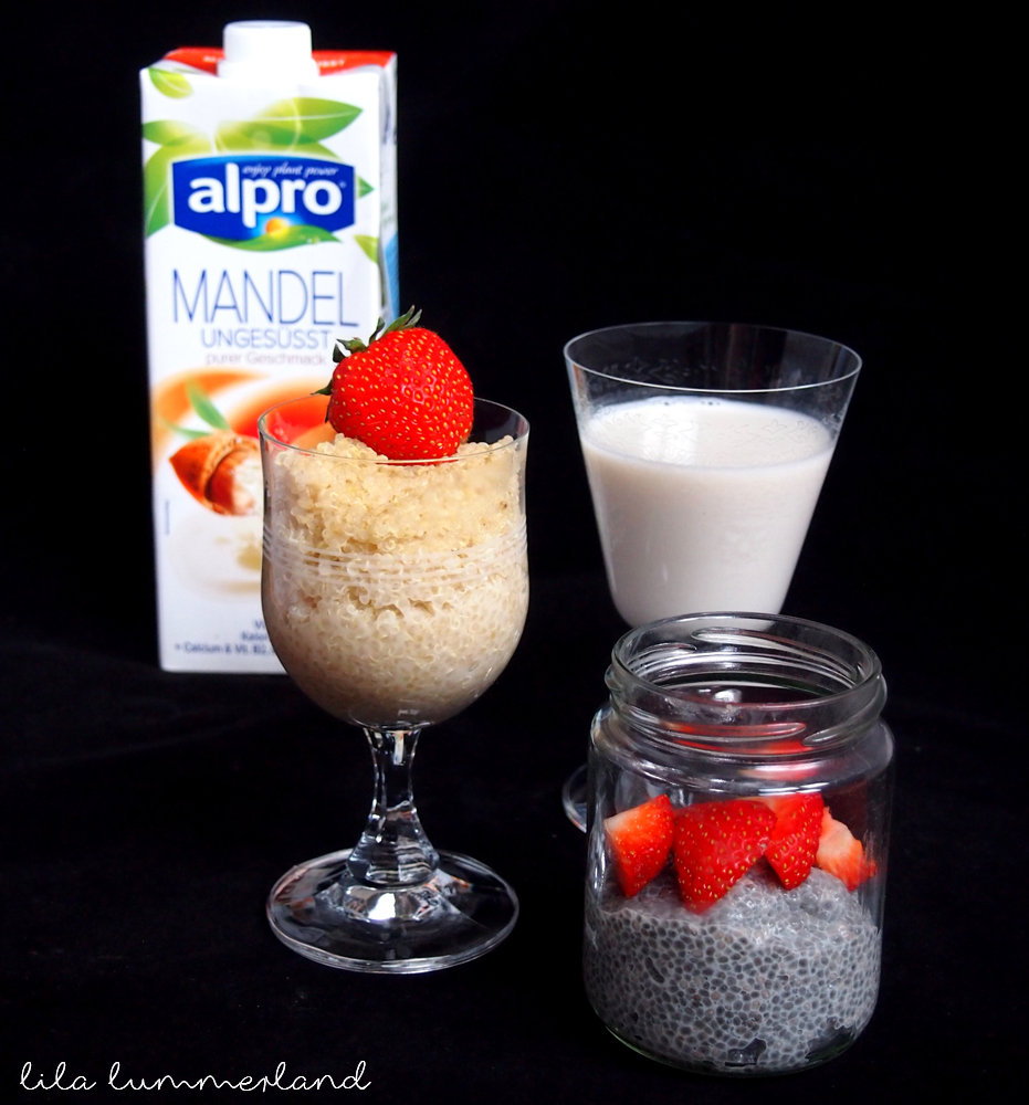 Wer skeptisch ist, fängt vielleicht mit einer Verarbeitungsart an, bei der der Geschmack des ungesüßten Mandeldrinks weniger ins Gewicht fällt. Statt Quinoa (die ich ja gerne als Breakfast Quinoa zum Frühstück esse) in Wasser zu kochen, könnt ihr ein bisschen Gehalt hinzufügen, indem ihr sie in Mandeldrink kocht. Da der allerdings recht teuer ist, bin ich dazu übergegangen, Quinoa in einer 50:50-Mischung Wasser und Mandeldrink zuzubereiten.