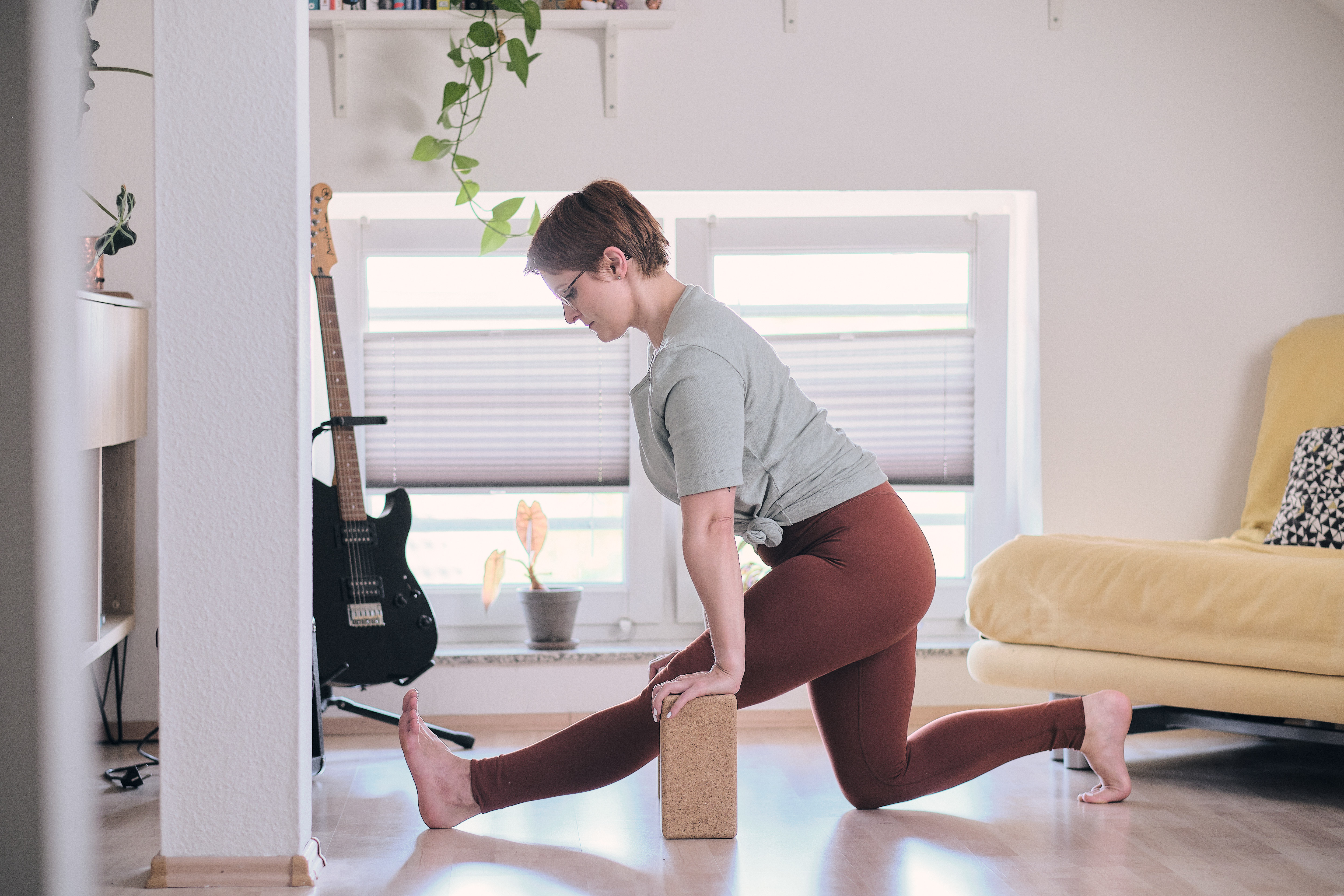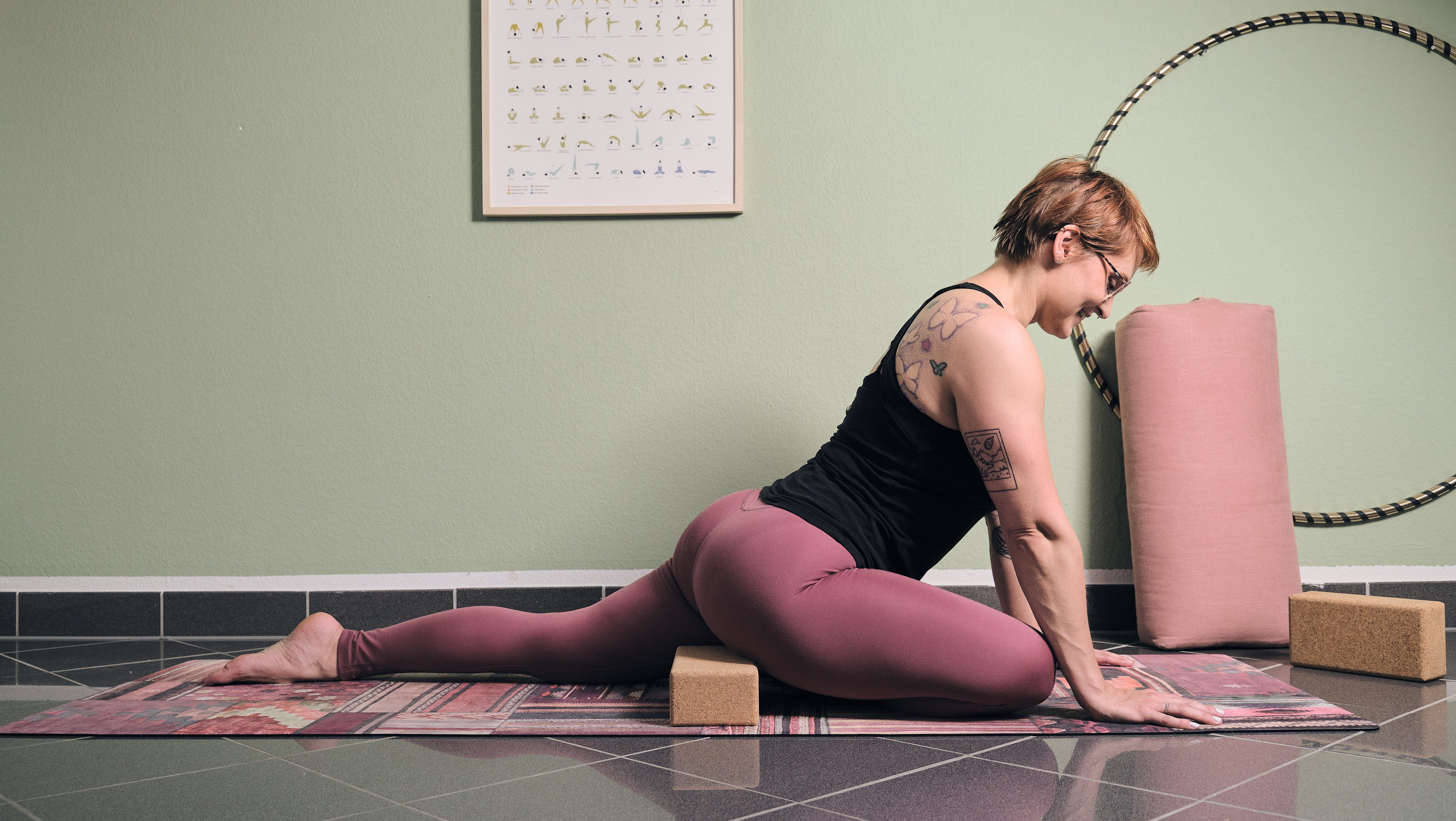 In manchen Posen hilft ein Block zwischen Körper und Matte, um Spannung aus der Muskulatur zu nehmen, wie z.B. in der Taube. Denn bei vielen Menschen sinkt hier die Hüfte nicht bis auf die Matte ab (völlig normal!) und die Lücke, die entsteht, wird oft durch Muskelspannung gehalten. Dabei darfst du dich hier ruhig auf einen Block ablegen.