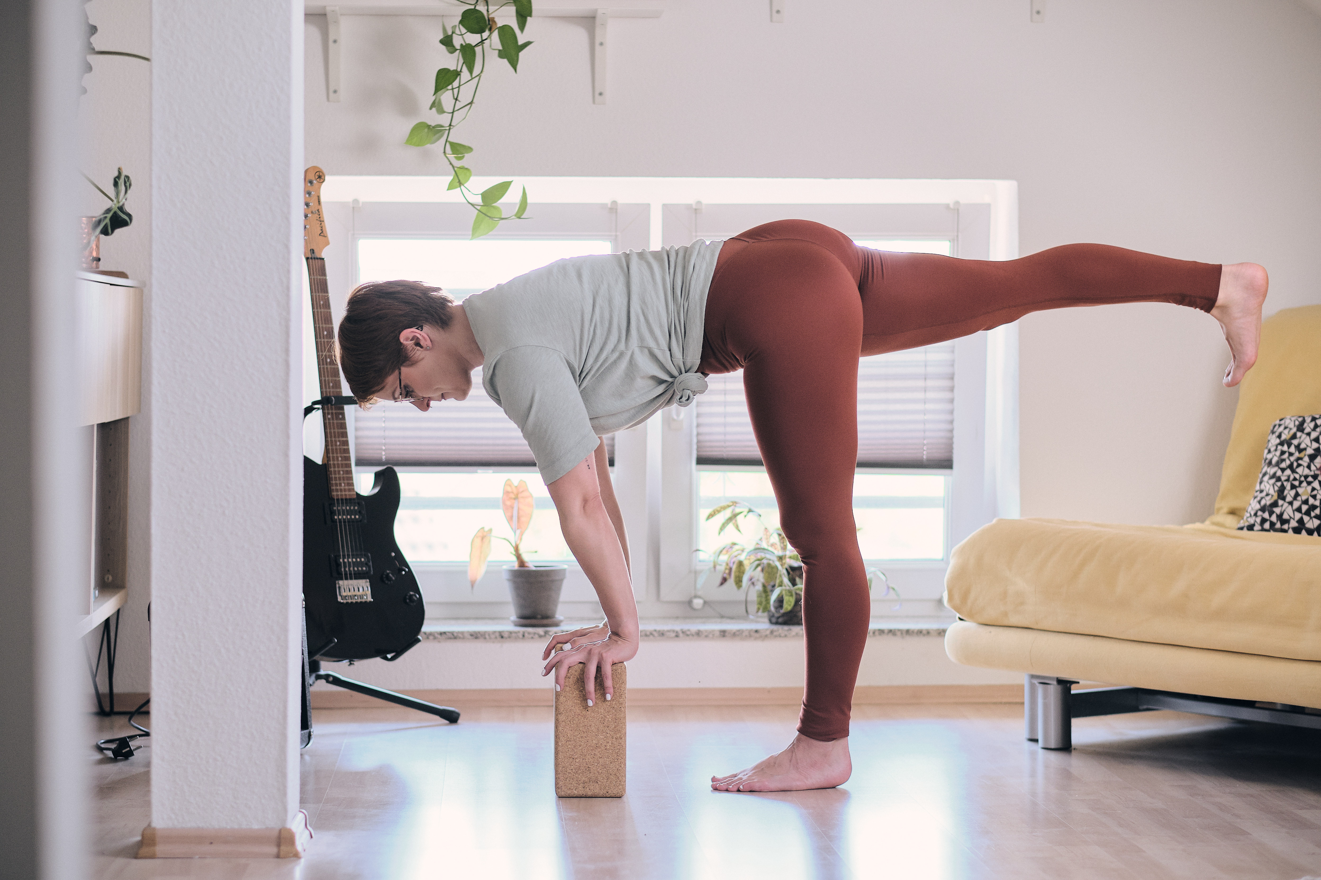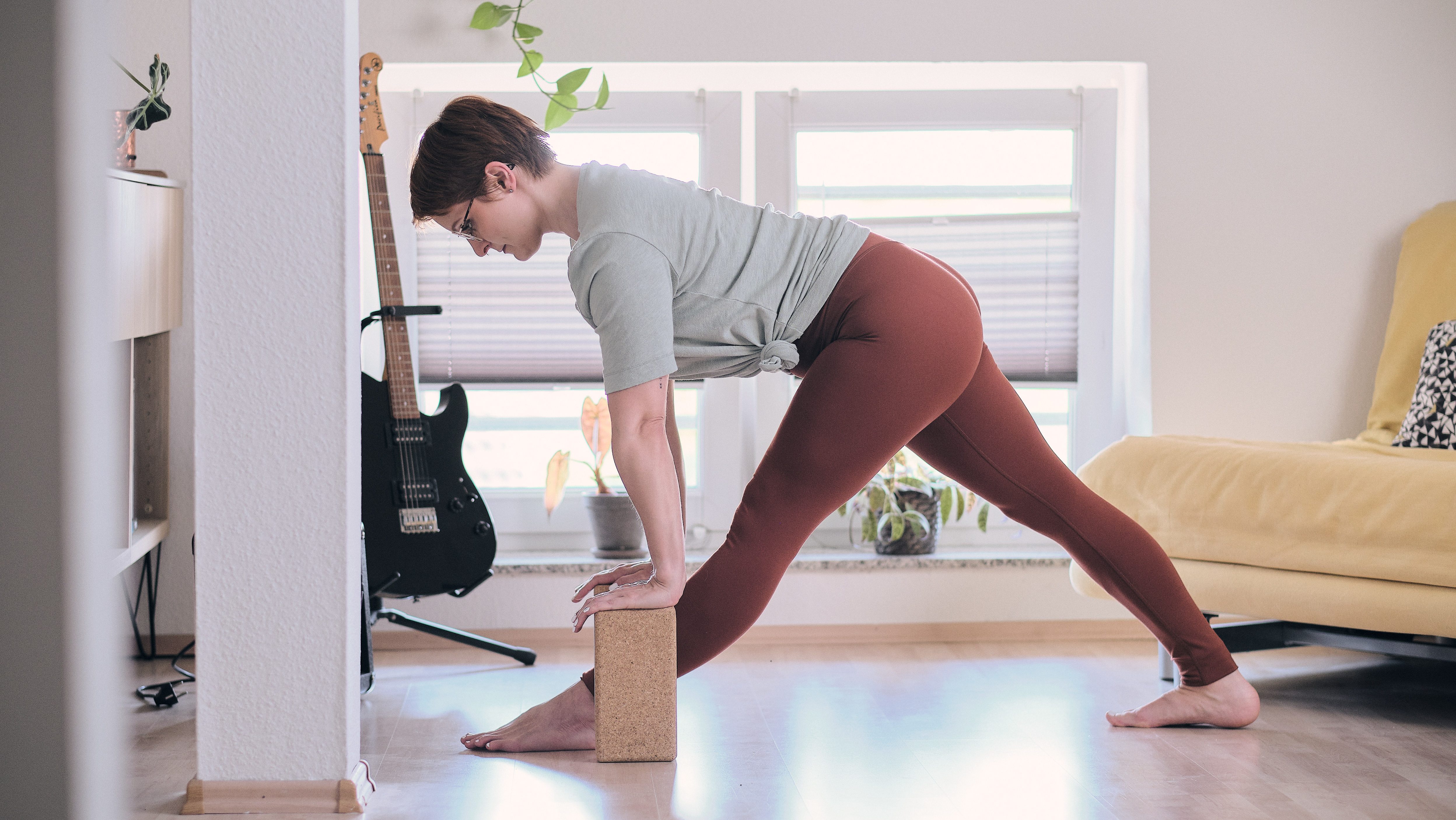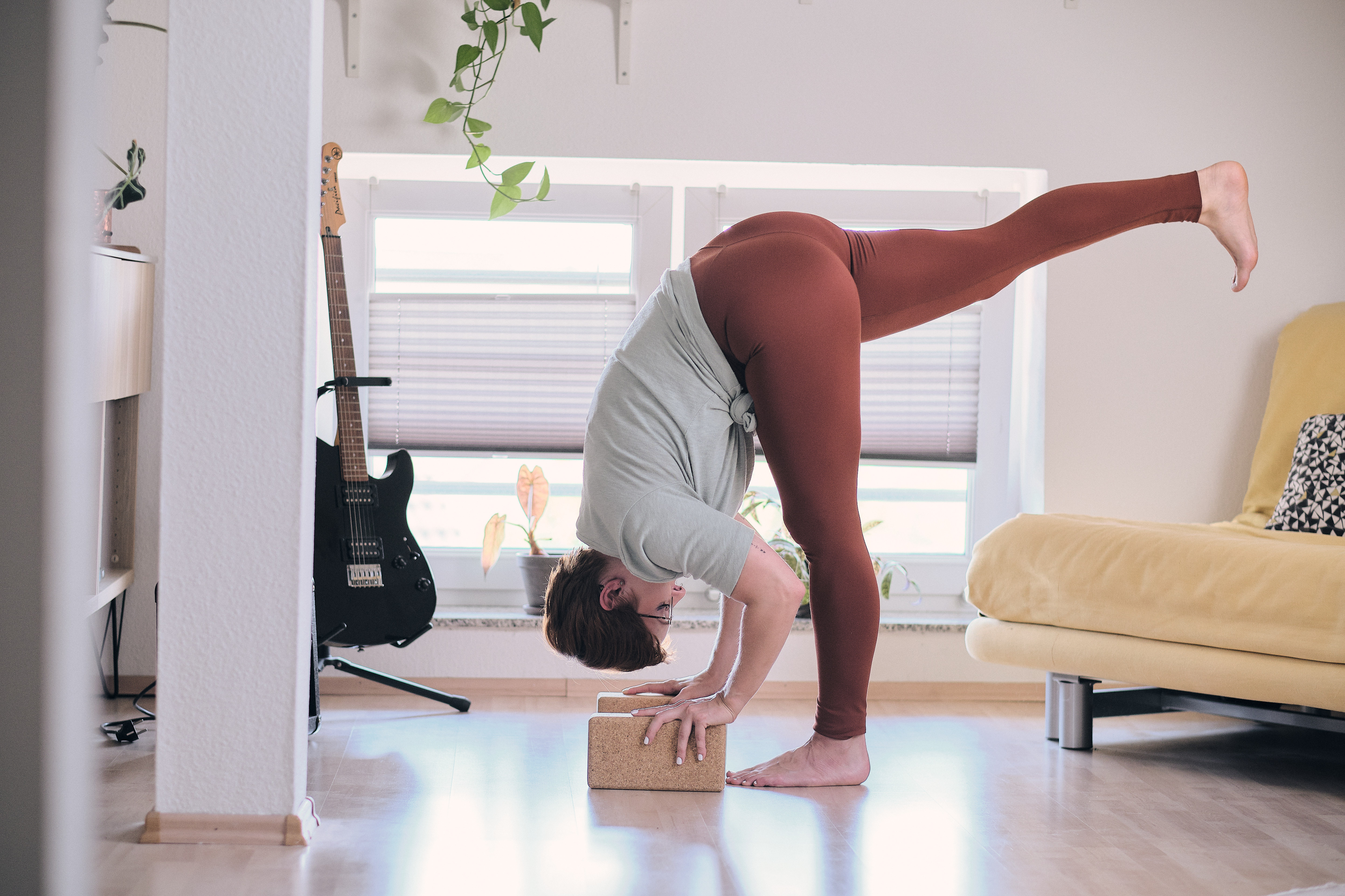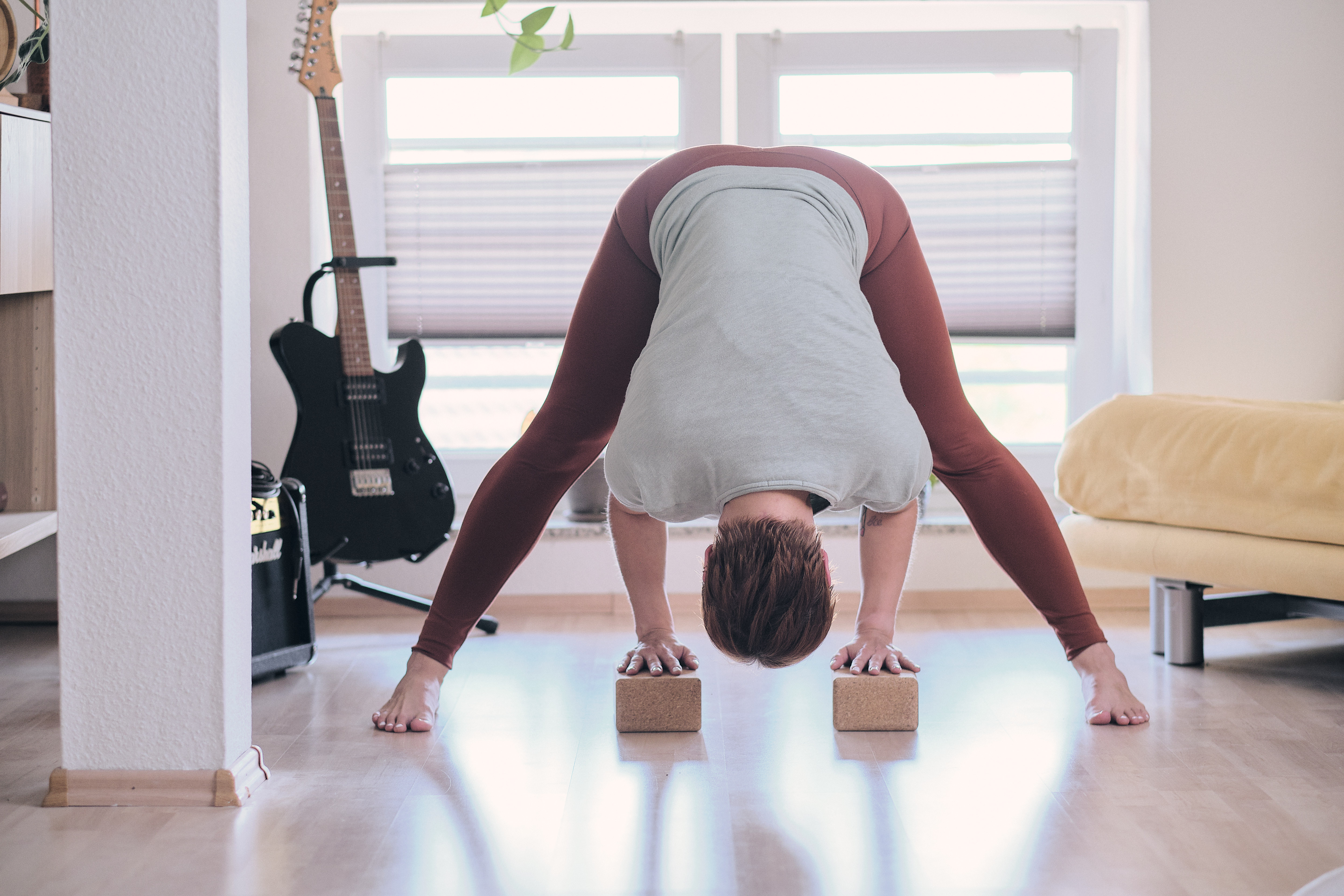 Das funktioniert v.a. in Vorbeugen und stehenden Posen mit gestreckten Beinen. Um den Rücken nicht unnötig krumm und schief zu halten, ergibt es hier durchaus Sinn, sich den Boden einfach näher zu bringen, indem du dir Blöcke unter den Händen positionierst.