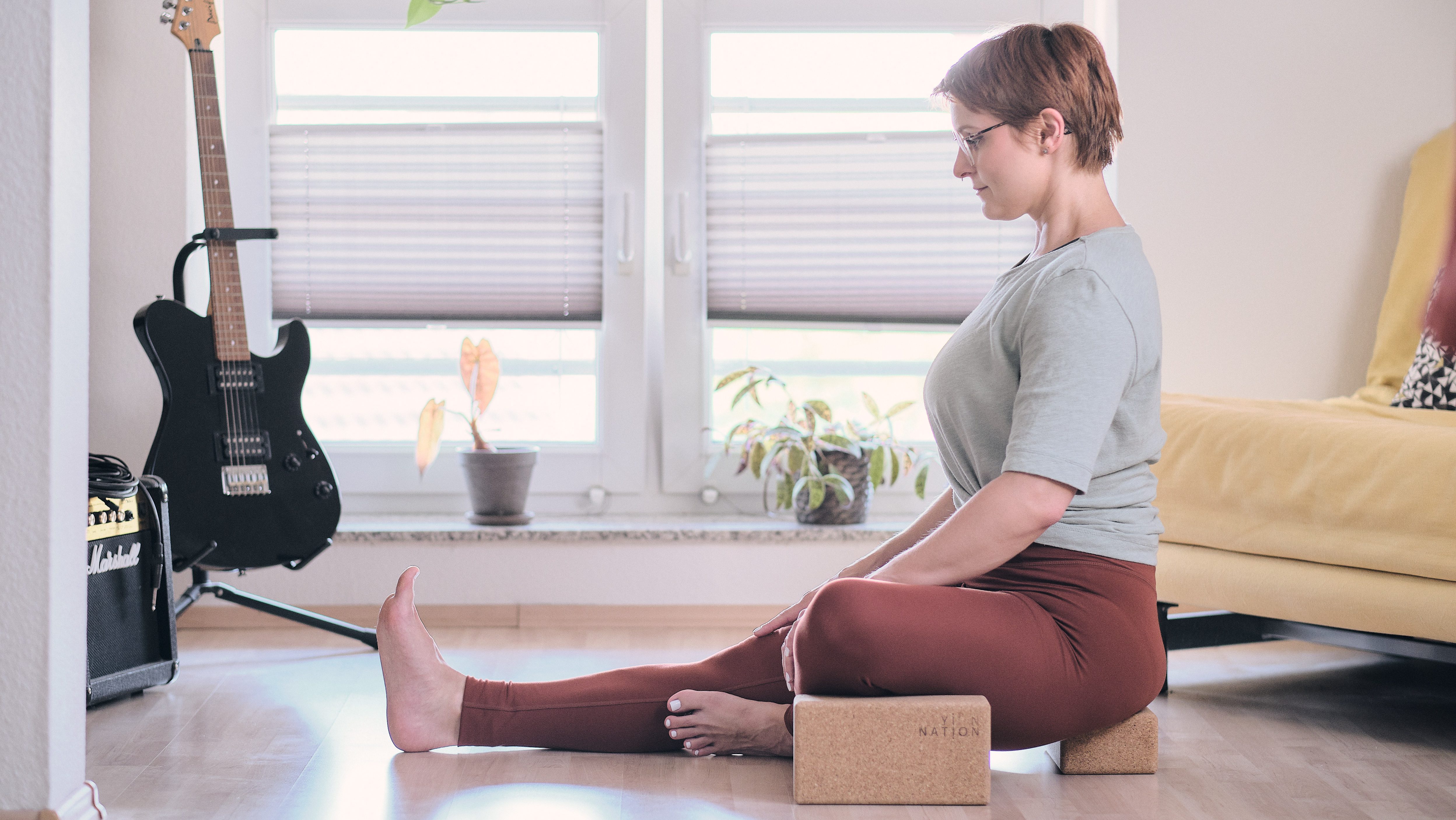 Auch hier geht es um den Abstand zum Boden und darum, diesen bequemer zu überbrücken. Zum Beispiel im Sitzen, um die Sitzhöcker zu erden. Gerade beim Schneidersitz kann die erhöhte Sitzposition dabei helfen, die Beine und das Becken zu entspannen und den Rücken so leichter aufzurichten.