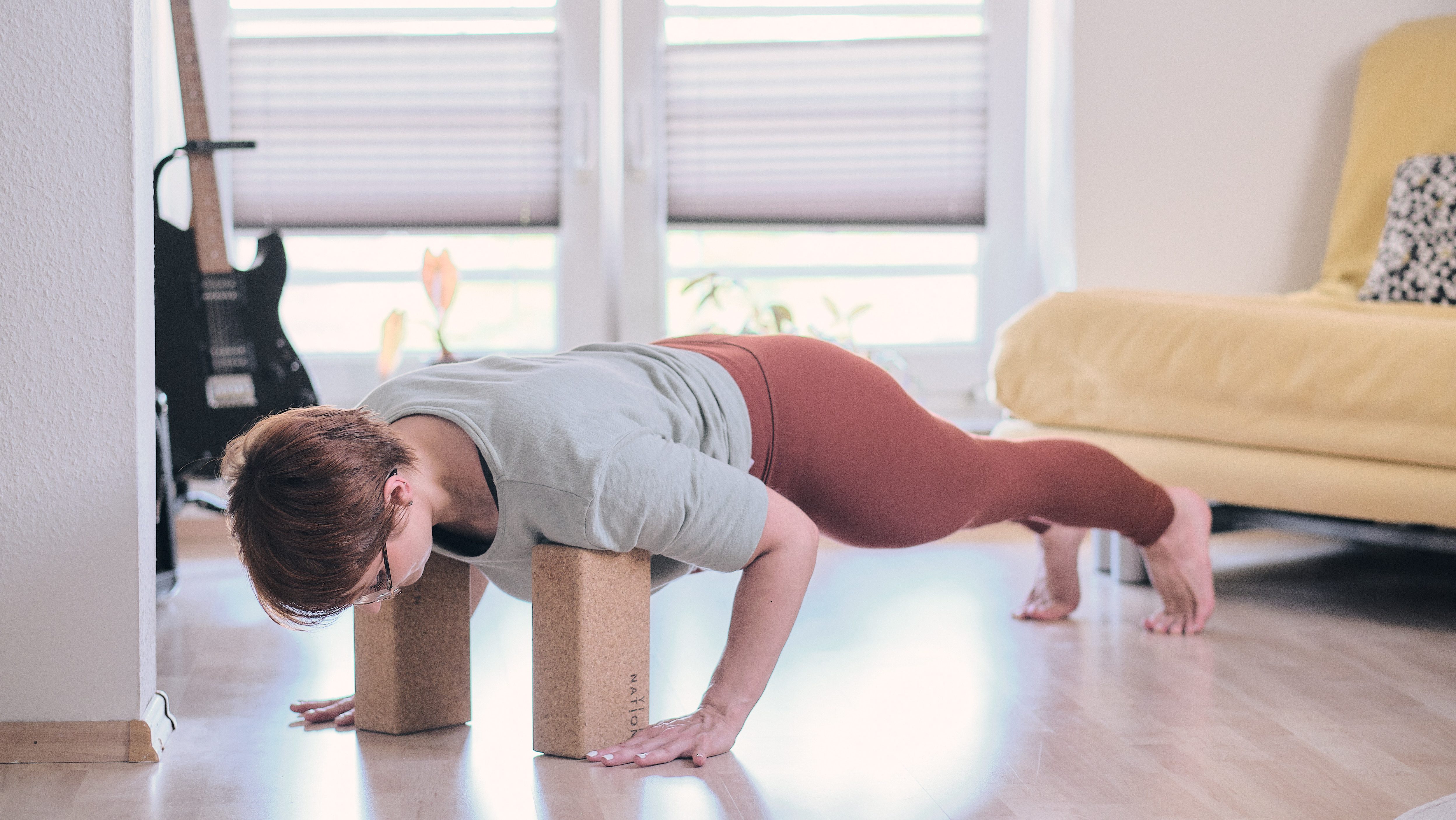 Und während der Einsatz von Blöcken häufig mit Anfänger:innen assoziiert wird, können sie ebenso gut genutzt werden, um Übungen zu vertiefen, indem sie den Boden weiter weg bringen (wenn du zum Beispiel auf den Blöcken stehst und dann versuchst, mit den Händen den Boden zu erreichen).