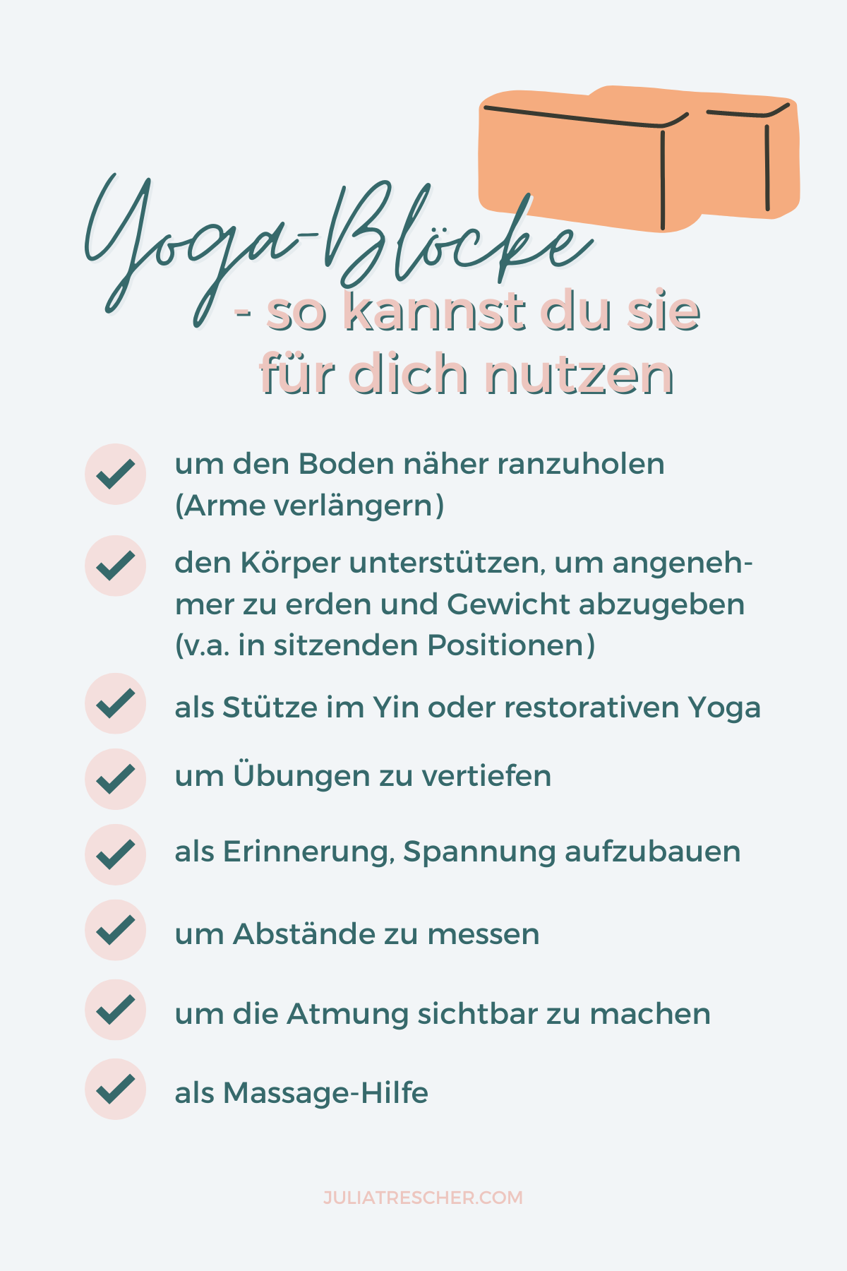 Du kennst noch mehr Möglichkeiten, einen Block in deine Yoga-Praxis einzubauen? Schreibe mir gerne und wir ergänzen die Liste gemeinsam!